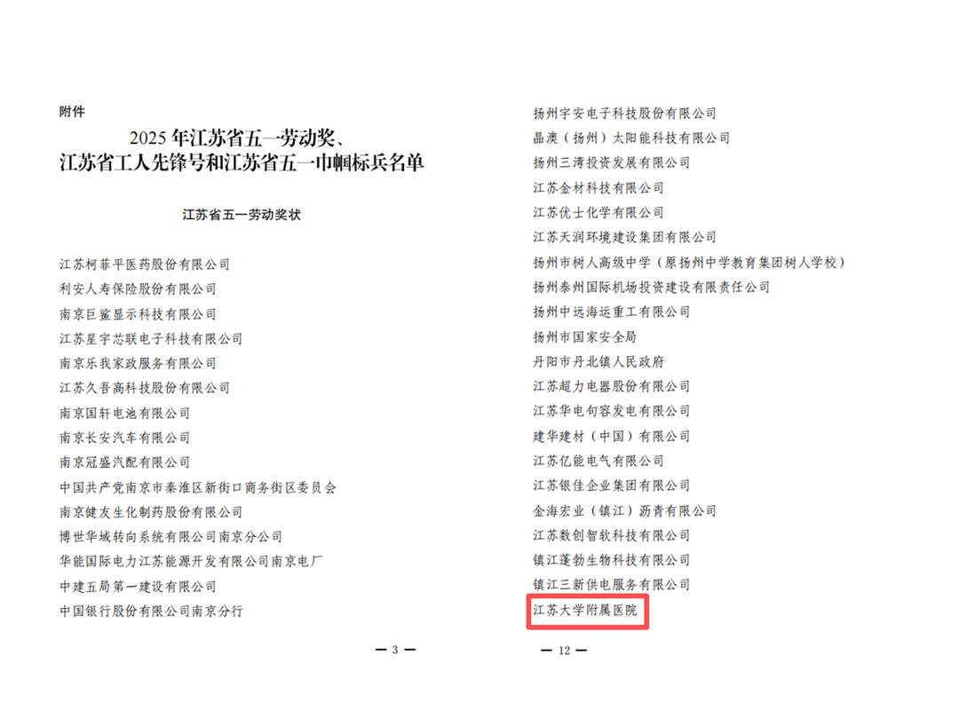 表彰事件与获奖主体 - 江苏省总工会与省人社厅联合发文,表彰2025年江苏省五一劳动奖、江苏省工人先锋号和江苏省五一巾帼标兵 [1] - 江苏大学附属医院荣获江苏省五一劳动奖状,是镇江市唯一获此殊荣的医疗机构 [1] - 获奖名单中包含多家江苏省内企业、事业单位及政府机构,例如晶澳(扬州)太阳能科技有限公司、江苏柯菲平医药股份有限公司、利安人寿保险股份有限公司等 [2] 获奖主体背景与成就 - 江苏大学附属医院是原卫生部首批命名的三级甲等医院、江苏省卫健委直管医院、全市唯一的省属高校直属附属医院 [3] - 医院连续四年在国家三级公立医院绩效考核中获评A等次,连续三年在镇江市公立医院绩效考核中排名第一 [3] - 医院实施“精术至善、强基筑峰、创新赋能、匠心育才、引凤汇智、管理增效”六大工程,在提升医疗服务质量、改善患者就医体验、医学科研创新及社会公益事业方面取得成果 [3] 表彰意义与未来展望 - 此次表彰是对江苏大学附属医院实干担当、锐意进取的高度肯定,也是对全院同心同德、敬业奉献的荣耀见证 [6] - 医院将以此为契机,弘扬劳模精神、劳动精神、工匠精神,发挥示范引领作用,为健康中国、健康江苏、健康镇江建设作出贡献 [6]