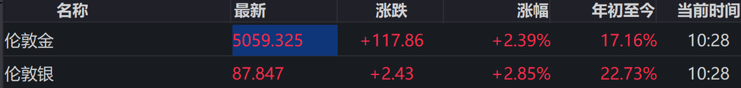 贵金属市场价格表现 - 现货黄金于2月4日收复5000美元/盎司关口,在10:28报5059.325美元/盎司,日内上涨117.86美元,涨幅达2.39% [1] - 现货黄金年初至今表现强劲,累计涨幅为17.16% [1] - 现货白银在同期报87.847美元/盎司,日内上涨2.43美元,涨幅为2.85% [1] - 现货白银年初至今累计涨幅更为显著,达到22.73% [1] 伦敦金银基准价格数据 - 伦敦金最新报价为5059.325美元/盎司,日内涨跌+117.86,涨幅+2.39%,年初至今涨幅17.16%,数据时间为10:28 [2] - 伦敦银最新报价为87.847美元/盎司,日内涨跌+2.43,涨幅+2.85%,年初至今涨幅22.73%,数据时间同样为10:28 [2]