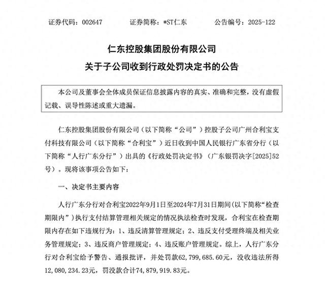 【文/羽扇观金工作室】 岁末年初,第三方支付行业再掀波澜。 2025年12月31日,中国人民银行广东省分行披露一则行政处罚信息,广州合利宝支付科技有限公司因四 项业务违规,被处以警告、通报批评,罚款6279.97万元,没收违法所得1208.02万元,罚没款项合计 7487.99万元。 与此同时,该公司相关负责人赵某生因对清算管理违规行为负有直接责任,被另行处以92.5万元罚款。 这一处罚金额刷新了2025年度支付行业罚单纪录,引发市场高度关注。 公开资料显示,合利宝支付于2013年在广州注册成立,注册资本1亿元,持有央行核发的《支付业务许 可证》,获准在全国范围内从事储值账户运营及支付交易处理业务,并具备跨境人民币支付资质。该公 司由A股上市企业*ST仁东间接持股95%,是后者主营业务的核心运营载体。 此次监管部门认定的违规事项涉及四个层面:清算管理不合规、支付受理终端及相关业务管理存在漏 洞、商户准入与管理失范、账户管理制度执行不到位。 上述问题几乎覆盖了收单支付业务的全流程关键节点,折射出企业内控机制的深层缺陷。面对监管重 罚,*ST仁东迅速发布公告回应,表示合利宝已足额缴纳罚款,当前经营秩序正常,并强调 ...