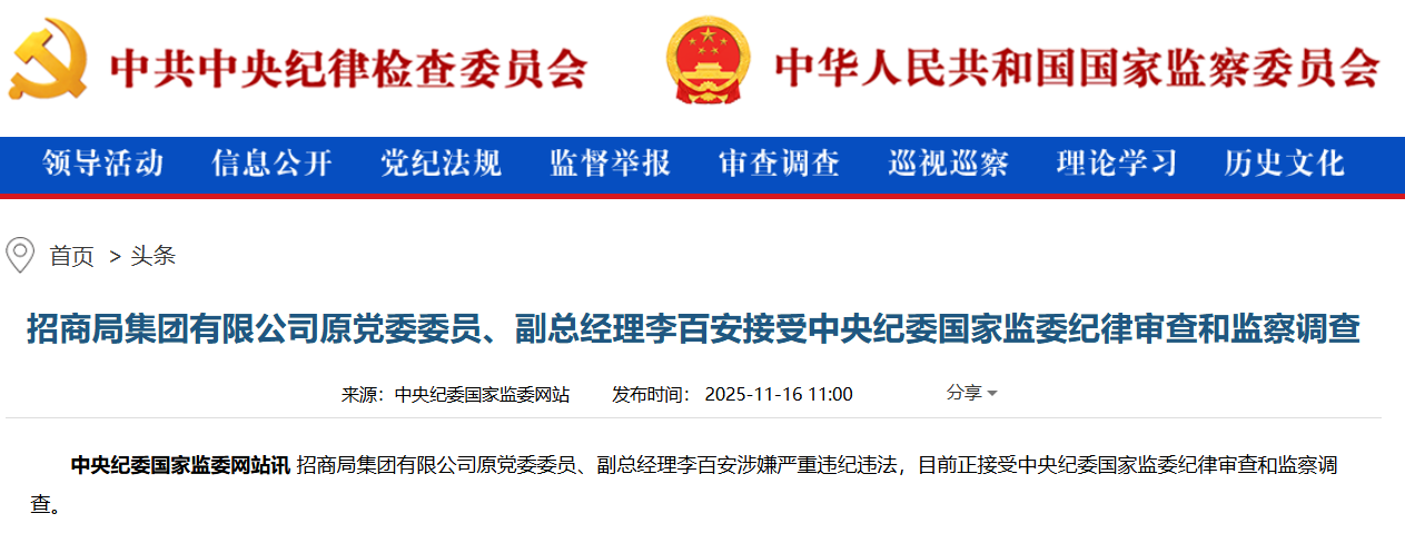 据中央纪委国家监委网站11月16日消息,招商局集团有限公司原党委委员、副总经理李百安涉嫌严重违纪违法,目前正接受中央纪委国家监委纪律审查和监 察调查。 公开信息显示,李百安,男,1964年12月出生,中共党员,毕业于浙江大学、对外经济贸易大学,硕士,高级经济师。 李百安 招商局集团 李百安曾任中国建筑工程总公司人力资源部副总经理、企业策划与管理部总经理,中建二局董事长、党委书记,中国建筑股份有限公司副总经理兼投资部总 经理,中建地产执行董事、总经理,中国建筑股份有限公司副总裁等职务。 2019年11月,李百安出任招商局集团有限公司党委委员,此后担任招商局集团有限公司副总经理、总法律顾问等职务。2023年4月新增兼任中国(广东)自 由贸易试验区深圳前海蛇口片区管理委员会常务副主任。 今年1月17日,招商局集团在深圳召开2025年度工作会议。在党建工作暨党风廉政建设和反腐败工作会议上,集团党委委员、副总经理李百安主持会议并传 达有关会议精神,会上播放了警示教育片,开展警示教育。 中央纪委国家监委网站截图 本文系观察者网独家稿件,未经授权,不得转载。 ...