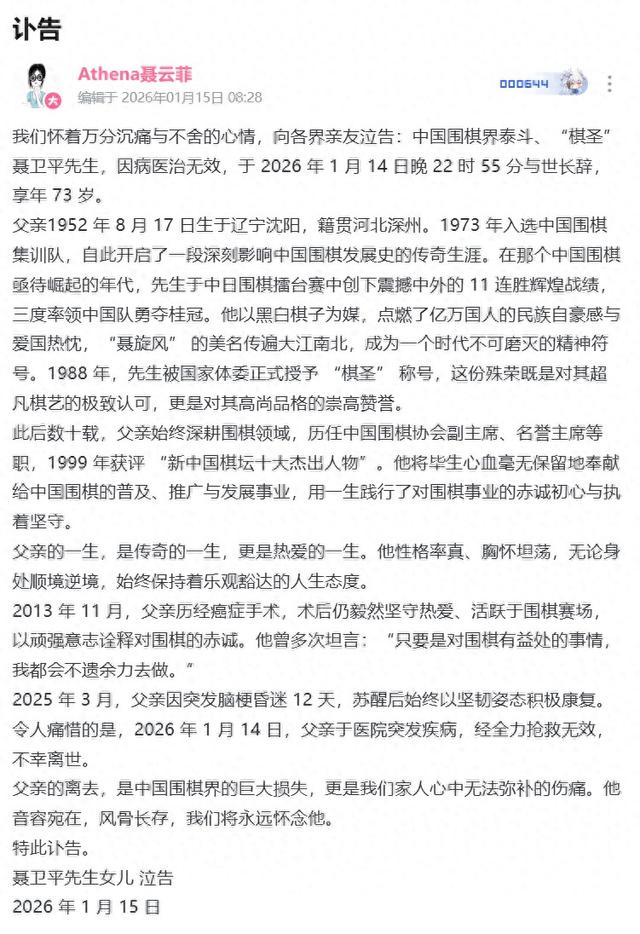 事件概述 - 中国围棋协会名誉主席、“棋圣”聂卫平九段于2026年1月14日晚病逝,享年74岁[1] 其女儿聂云菲于次日发布讣告,确认聂卫平先生于2026年1月14日22时55分因病医治无效去世,享年73岁[2] 生平与职业生涯 - 聂卫平于1952年8月17日生于辽宁沈阳,籍贯河北深州,1973年入选中国围棋集训队,开启其职业生涯[2] - 在中日围棋擂台赛中创下11连胜的辉煌战绩,并三度率领中国队夺得冠军,极大地振奋了民族精神,赢得了“聂旋风”的美誉[2] - 1988年被国家体委正式授予“棋圣”称号,以表彰其超凡棋艺与高尚品格[2] - 长期深耕围棋领域,历任中国围棋协会副主席、名誉主席等职,1999年被评为“新中国棋坛十大杰出人物”[2] - 将毕生心血奉献给中国围棋的普及、推广与发展事业[2] 健康状况与晚年 - 2013年11月经历癌症手术,术后仍坚持活跃于围棋赛场[3] - 2025年3月因突发脑梗昏迷12天,苏醒后积极进行康复[3] - 2026年1月14日在医院突发疾病,经全力抢救无效后离世[3] 社会影响与家庭 - 聂卫平的逝世被描述为中国围棋界的巨大损失[3] - 其女儿聂云菲通过哔哩哔哩个人账号发布讣告并表达深切哀思,将账号个性签名更改为“老爸,我好想你”[2][8] - 聂云菲在发文中表达了悲痛与对人生无常的感慨[7]