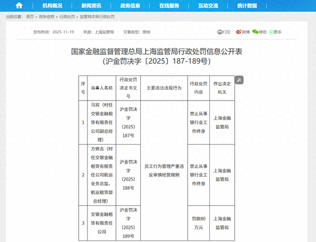 11月19日,国家金融监督管理总局上海监管局发布行政处罚信息公开表,其中显示,因员工行为管理严 重违反审慎经营规则,时任交银金融租赁有限责任公司副总经理马宾,时任交银金融租赁有限责任公司 航运业务总监、航运租赁部总经理方修志,被处以禁止从事银行业工作终身的处罚。 交银金融租赁有限责任公司被处以罚款80万元。 | A | 政务信息 | 在线服务 互动交流 统计数据 | 机构概况 | 新闻资讯 | | | | | --- | --- | --- | --- | --- | --- | --- | --- | | 当朝位置:首页 > 政务信息 > 行政处罚 > 监管局本级行改处罚 | | | | | | | | | SITH ANN BAND OPS | 来源:上海监管局 文章类型:原创 | 发布时间:2025-11-19 | | | | | | | 国家金融监督管理总局上海监管局行政处罚信息公开表 | (沪金罚决字〔2025〕 187-189号) | | | | | | | | 行政处罚 | 彩 | 行政处罚 | 作出决定 | 网 | 当事人名称 | 决定书文 | 主要违法违规行为 | | 号 | 内容 | 机关 ...