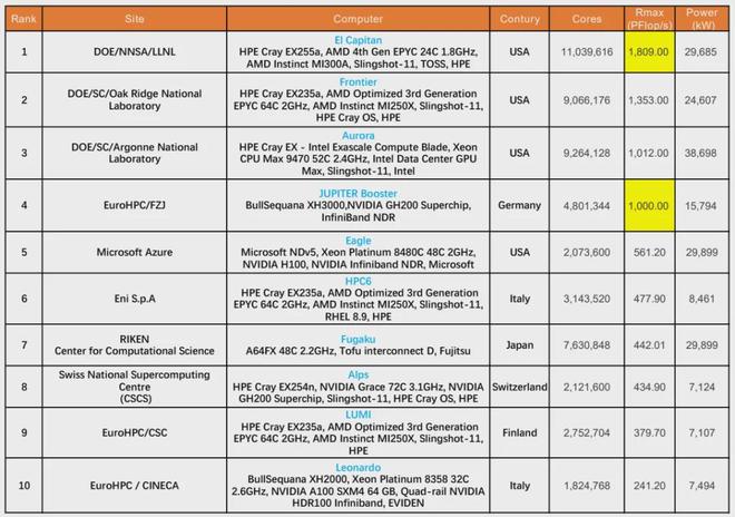 11月17日,评测超级计算机计算能力的权威排行榜——第66届国际超算TOP500榜单在SC25大会上正式揭晓。本次榜单最大亮点在于,德国于利希超算中 心的"JUPITER Booster"完成全面部署后,性能成功突破E级(百亿亿次/秒)大关,不仅成为欧洲首台E级超算,更是TOP500榜单中的第四台E级超算系 统。整体来看,本届榜单TOP10阵营保持稳定格局,美国能源部旗下的El Capitan、Frontier、Aurora三台E级超算继续包揽前三,无新系统跻身前十。 | Rmax | Power | Rank | Site | Computer | Contury | Cores | (PFlop/s) | (KW) | | --- | --- | --- | --- | --- | --- | --- | --- | --- | | El Capitan | HPE Cray EX255a, AMD 4th Gen EPYC 24C 1.8GHz, | 1 | DOE/NNSA/LLNL | USA | 11,039,616 | 1,809.00 | 29,685 | | | AMD Instinct M ...