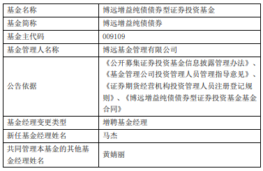 核心人事变动 - 博远基金增聘马杰为博远增益纯债债券型证券投资基金的基金经理,与黄婧丽共同管理该基金 [1][2] - 新任基金经理马杰拥有丰富的金融从业经验,历任中国工商银行深圳分行、招商证券、招商银行等机构相关职位,并于2024年9月加入博远基金,现任固定收益投资总部首席研究员 [1] 基金产品信息 - 此次涉及变动的基金为博远增益纯债债券型证券投资基金,基金主代码为601600,由博远基金管理有限公司管理 [2] - 该基金分为A类份额(代码009109)和C类份额(代码009110),成立于2022年04月28日 [1] - 截至2026年02月26日,该基金A类份额今年来收益率为0.37%,成立以来收益率为13.74%,累计净值为1.1314元;C类份额今年来收益率为0.34%,成立以来收益率为7.95%,累计净值为1.0785元 [1] 公告依据与变更类型 - 此次基金经理变更类型为“增聘基金经理”,公告依据包括《公开募集证券投资基金信息披露管理办法》等相关法规及基金合同 [2]