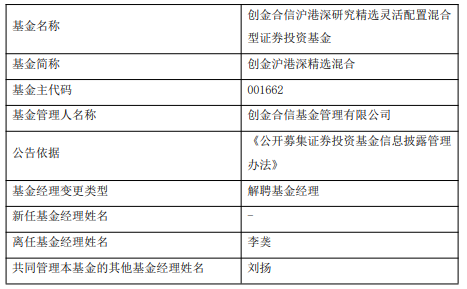中国经济网北京1月14日讯 今日,创金合信基金公告,李离任创金合信沪港深精选混合。 (责任编辑:康博) 李䶮2012年4月加入兴业证券股份有限公司研究所,担任地产行业研究员,主要从事地产行业跟踪 和股票推荐等工作,2015年6月加创金合信基金管理有限公司,历任研究部研究员、基金经理助理,现 任基金经理。 | 基金名称 | 创金合信沪港深研究精选灵活配置混合 | | --- | --- | | | 型证券投资基金 | | 基金简称 | 创金沪港深精选混合 | | 基金主代码 | 001662 | | 基金管理人名称 | 创金合信基金管理有限公司 | | 公告依据 | 《公开募集证券投资基金信息披露管理 | | | 办法》 | | 基金经理变更类型 | 解聘基金经理 | | 新任基金经理姓名 | - | | 离任基金经理姓名 | 李孝 | | 共同管理本基金的其他基金经理姓名 | 刘扬 | 创金合信沪港深精选混合(001662)成立于2015年08月24日,截至2026年01月13日,其今年来收益率 为5.33%,成立来收益率为24.40%,累计净值为1.2440元。 ...