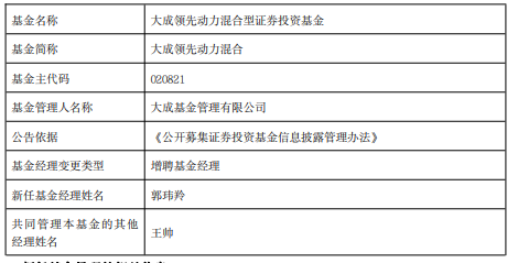 大成领先动力混合A/C成立于2024年08月28日,截至2026年01月13日,其今年来收益率为2.88%、 2.87%,成立来收益率为25.20%、24.47%,累计净值为1.2520元、1.2447元。 大成互联网思维混合A/C成立于2015年04月21日和2023年05月18日,截至2026年01月13日,其今年来收 益率为4.72%、4.70%,成立来收益率为118.94%、35.01%,累计净值为2.1894元、2.1601元。 中国经济网北京1月14日讯今日,大成基金公告,大成领先动力混合、大成互联网思维混合、大成科创 主题混合(LOF)增聘郭玮羚。 郭玮羚2015年7月加入大成基金管理有限公司,曾担任研究部研究员、基金经理助理,现任股票投资部 基金经理。 | 基金名称 | 大成领先动力混合型证券投资基金 | | --- | --- | | 基金间称 | 大成领先动力混合 | | 基金主代码 | 020821 | | 基金管理人名称 | 大成基金管理有限公司 | | 公告依据 | 《公开募集证券投资基金信息披露管理办法》 | | 基金经理变更类型 | 增聘基金经理 | | 新任基金经理姓名 | 郭 ...