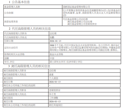 公告显示,张鹏2008年7月起,历任中国证监会北京监管局机构一处主任科员、银河金汇证券资产管理 有限公司合规总监兼首席风险官(副总经理级)、华融基金管理有限公司督察长,现任国新国证基金管理 有限公司副总经理、督察长。 | 1 公告基本信息 | | | --- | --- | | 甚全管理人名称 | 国新国正基金管理有限公司 | | | 《公开展集正券投资基金信息按摩管理办法》、正券基金5 | | 公告依据 | 贡机构资事,监事,高级管理人员及从业人员监督管理办 | | | 代任基金管理公司总经理 | | 高管变更出型 | | | | 离任基金管理公司总经理 | | | 离任基金管理公司首席投资官 | | 2 代任高级管理人员的相关信息 | | | 代任高级管理人员职务 | 总经理 | | 代任高级管理人员姓名 | 张鹏 | | 任职日期 | 2026-01-13 | | | 2008年7月起,历任中国证监会北京监管局机构一处主任科员、银河金湾 | | 过往从业经历 | 证券资产管理有限公司合规总监兼首席风险官(副总经理级),华隐基金管 | | | 理有限公司督察长,现任国新田正基金管理有限公司副总经理,督察长 ...