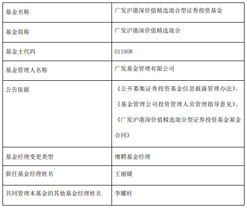 中国经济网北京1月14日讯 今日,广发基金公告,广发沪港深价值精选混合增聘王丽媛。 广发沪港深价值精选混合A/C成立于2021年05月25日,截至2026年01月13日,其今年来收益率为 7.28%、7.26%,成立来收益率为-21.59%、-23.15%,累计净值为0.7841元、0.7685元。 王丽媛2013年1月至2014年4月在华创证券股份有限公司研究所任分析师,2014年5月至2016年8月在 长盛基金管理有限公司研究部任研究员,2016年9月23日至2021年8月在建信基金管理有限公司专户投资 部先后任投资经理助理、投资经理。2021年8月18日加入广发基金管理有限公司,现任国际业务部基金 经理。 | 基金名称 | 广发沪港深价值精选混合型证券投资基金 | | --- | --- | | 基金简称 | 广发沪港深价值精选混合 | | 基金主代码 | 011908 | | 基金管理人名称 | 广发基金管理有限公司 | | 公告依据 | 《公开募集证券投资基金信息披露管理办法》、 | | | 《基金管理公司投资管理人员管理指导意见》、 | | | 《广发沪港深价值精选混合型证券投资基金基金 | | ...
