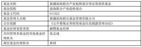 (责任编辑:郭健东 ) 林材2011年10月至2015年7月任金元顺安基金经理,2008年11月至2011年10月任民生加银基金医药 行业研究员、基金经理助理。2000年7月至2003年9月曾任职于广州医药集团。于2015年9月加入前海联 合基金,2020年2月18日起担任新疆前海联合基金经理。 【免责声明】本文仅代表作者本人观点,与和讯网无关。和讯网站对文中陈述、观点判断保持中立,不对所包含内容 的准确性、可靠性或完整性提供任何明示或暗示的保证。请读者仅作参考,并请自行承担全部责任。邮箱: news_center@staff.hexun.com | 基金名称 | 新疆前海联合产业趋势混合型证券投资基金 | | --- | --- | | 基金简称 | 前海联合产业趋势混合 | | 基金主代码 | 011523 | | 基金管理人名称 | 新疆前海联合基金管理有限公司 | | 公告依据 | 《公开募集证券投资基金信息披露管理办法》 | | 准令经抽拿电索亚 | 解聘基金经理 | | 共同管理本基金的其他基金经 | 张志成 | | 理姓名 | | | 离任基金经理姓名 | 林材 | 中国经济网北京11月25日讯 ...