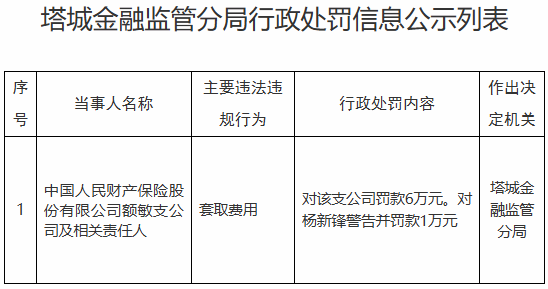 中国经济网北京1月20日讯 国家金融监督管理总局网站昨日公布的塔城金融监管分局行政处罚信息 公示列表显示,中国人民财产保险股份有限公司额敏支公司及相关责任人套取费用。塔城金融监管分局 对该支公司罚款6万元;对杨新锋警告并罚款1万元。 (责任编辑:田云绯) 以下为原文: | 序 | 当事人名称 | 主要违法违 | 行政处罚内容 | 作出决 | | --- | --- | --- | --- | --- | | 릉 | | 规行为 | | 定机关 | | 1 | 中国人民财产保险股 份有限公司额敏支公 司及相关责任人 | | 杨新锋警告并罚款1万元 | 塔城金 | | | | 套取费用 | 对该支公司罚款6万元。对 | 融监管 | | | | | | 分局 | ...