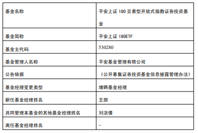 (责任编辑:康博) | 基金名称 | 平安中证粤港澳大湾区发展主题交易型开放 | | --- | --- | | | 式指数证券投资基金 | | 基金简称 | 粤港澳大湾区 ETF | | 基金主代码 | 512970 | | 基金管理人名称 | 平安基金管理有限公司 | | 公告依据 | 《公开募集证券投资基金信息披露管理办法》 | | 基金经理变更类型 | 增聘基金经理 | | 新任基金经理姓名 | 王娜 | | 共同管理本基金的其他基金经理姓名 | 自圭尧 | | 高任基金经理姓名 | - | | 基金名称 | 平安上证 180 交易型开放式指数证券投资基 | | --- | --- | | | 金联接基金 | | 基金简称 | 平安上证 180ETF 联接 | | 基金主代码 | 023547 | | 基金管理人名称 | 平安基金管理有限公司 | | 公告依据 | 《公开募集证券投资基金信息披露管理办法》 | | 基金经理变更类型 | 增聘基金经理 | | 新任基金经理姓名 | 王郧 | | 共同管理本基金的其他基金经理姓名 | 刘洁倩 | | 高任基金经理姓名 | - | 平安上证180ETF联接A ...