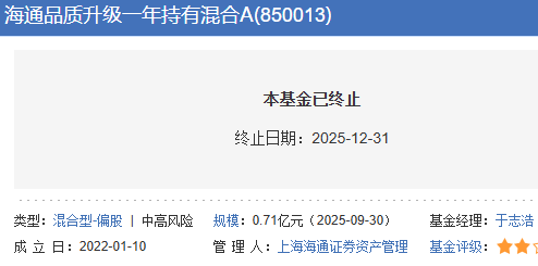 海通品质升级一年持有混合清盘 成立近4年亏损2成