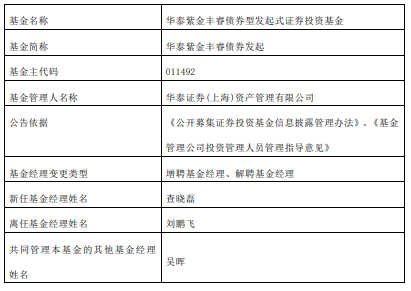 华泰紫金丰睿债券发起增聘查晓磊 刘鹏飞离任