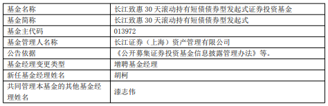 长江致惠30天滚动持有短债债券型发起式增聘胡柯