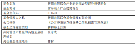 | 基金名称 | 新疆前海联合产业趋势混合型证券投资基金 | | --- | --- | | 基金简称 | 前海联合产业趋势混合 | | 基金主代码 | 011523 | | 基金管理人名称 | 新疆前海联合基金管理有限公司 | | 公告依据 | 《公开募集证券投资基金信息披露管理办法》 | | 基金经理变更类型 | 解聘基金经理 | | 共同管理本基金的其他基金经 | 张志成 | | 理姓名 | | | 离任基金经理姓名 | 林树 | (责任编辑:康博) 林材2011年10月至2015年7月任金元顺安基金经理,2008年11月至2011年10月任民生加银基金医药 行业研究员、基金经理助理。2000年7月至2003年9月曾任职于广州医药集团。于2015年9月加入前海联 合基金,2020年2月18日起担任新疆前海联合基金经理。 前海联合产业趋势混合A/C成立于2021年8月17日,截至2025年11月24日,其今年来收益率为 15.01%、14.58%,成立来收益率为-27.74%、-28.97%,累计净值为0.7226元、0.7103元。 中国经济网北京11月25日讯 今日,新疆前海联合基金公告,林材离任前海 ...