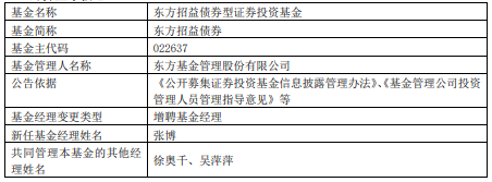 | 基金名称 | 东方招益债券型证券投资基金 | | --- | --- | | 基金简称 | 东方招益债券 | | 基金主代码 | 022637 | | 基金管理人名称 | 东方基金管理股份有限公司 | | 公告依据 | 《公开募集证券投资基金信息披露管理办法》、《基金管理公司投资 | | | 管理人员管理指导意见》等 | | 基金经理变更类型 | 增聘基金经理 | | 新任基金经理姓名 | 张博 | | 共同管理本基金的其他经 | 徐奥千、吴萍萍 | | 理姓名 | | (责任编辑:康博) 中国经济网北京11月25日讯 今日,东方基金公告,东方招益债券增聘张博。 张博,多元资产投资部部门总经理助理、公募投资决策委员会委员,北京邮电大学电磁场与微波技 术专业博士,15 年证券从业经历。曾任普天信息技术研究院有限公司产业研究员、渤海证券股份有限 公司高级研究员、天安财产保险股份有限公司投资经理、中信保诚人寿股份有限公司股票部主管兼投资 经理、金元顺安基金管理有限公司基金部投资副总监兼基金经理。2022年1月加盟东方基金,曾任绝对 收益部部门总经理助理、基金经理。 东方招益债券A/C成立于2024年12月24日 ...