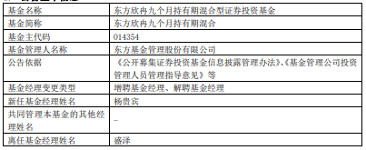 中国经济网北京11月25日讯 今日,东方基金公告,东方欣冉九个月持有期混合增聘杨贵宾,盛泽 离任。 | 基金名称 | 东方欣冉九个月持有期混合型证券投资基金 | | --- | --- | | 基金简称 | 东方欣冉九个月持有期混合 | | 基金主代码 | 014354 | | 基金管理人名称 | 东方基金管理股份有限公司 | | 公告依据 | 《公开募集证券投资基金信息披露管理办法》、《基金管理公司投资 管理人员管理指导意见》等 | | 基金经理变更类型 | 增聘基金经理、解聘基金经理 | | 新任基金经理姓名 | 杨贵宾 | | 共同管理本基金的其他经 | | | 理姓名 | | | 离任基金经理姓名 | 感泽 | 杨贵宾公司副总经理、公募投资决策委员会副主任委员,西安交通大学应用经济学博士,20 年证 券从业经历。曾任富国基金管理有限公司固定收益研究员、基金经理,上海海通证券资产管理有限责任 公司投资主办、固定收益投资总监、公司总助职位。2019年9月加盟东方基金,曾任公司总经理助理, 基金经理。 东方欣冉九个月持有期混合A/C成立于2022年7月12日,截至2025年11月24日,其今年来收益率为 5 ...
