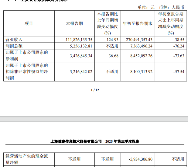 | 经营活动产生的现金流 | 不适用 | 不适用 | -5.934.306.80 | 不适用 | | --- | --- | --- | --- | --- | | 量净额 | | | | | 健麾信息于2020年12月22日在上交所主板上市,发行股份数量为34,000,000股,发行价格为14.20 元/股,保荐机构(主承销商)为国信证券股份有限公司,保荐代表人为孙婕、陈振瑜。 健麾信息上市募集资金总额为482,800,000.00元,募集资金净额为435,211,872.28元,分别用于健麾 信息医药物流智能产业化项目、市场营销与客户服务网络升级项目、医药物流机器人实验室建设项目、 药房自动化升级研发项目自动化设备投放项目、补充流动资金项目。 中国经济网北京11月25日讯 健麾信息(605186.SH)日前发布2025年三季度报告。2025年前三季 度,该公司实现营业收入2.70亿元,同比增长38.55%;实现归属于上市公司股东的净利润845.21万元, 同比下降73.63%;实现归属于上市公司股东的扣除非经常性损益的净利润810.03万元,同比下降 57.54%;经营活动产生的现金流量净额为-593.4 ...