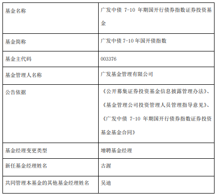 古渥2016年7月至2019年6月任大成基金管理有限公司交易管理部债券交易员,2019年6月至2022年3 月任博远基金管理有限公司集中交易室交易主管。2022年4月加入广发基金管理有限公司,先后任固定 收益交易部债券交易员、固定收益交易部总经理助理兼任利率交易组组长、特定策略投资部策略研究 员。 | 基金名称 | 广发安泽短债债券型证券投资基金 | | --- | --- | | 基金简称 | 广发安泽短债 | | 基金主代码 | 002864 | | 基金管理人名称 | 广发基金管理有限公司 | | 公告依据 | 《公开募集证券投资基金信息披露管理办法》、 | | | 《基金管理公司投资管理人员管理指导意见》、 | | | 《广发安泽短债债券型证券投资基金基金合同》 | | 基金经理变更类型 | 增聘基金经理、解聘基金经理 | | 新任基金经理姓名 | 古澤 | | 共同管理本基金的其他基金经理姓名 | 刘志辉 | | 离任基金经理姓名 | 吴迪 | (责任编辑:康博) 广发中债7-10年国开债指数A/C成立于2016年9月26日,广发中债7-10年国开债指数D成立于2024年 6月3日,广发中债7-10 ...