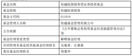 | 基金名称 | 恒越安裕纯债债券型证券投资基金 | | --- | --- | | 基金简称 | 恒越安裕纯债债券 | | 基金主代码 | 018516 | | 基金管理人名称 | 恒越基金管理有限公司 | | 公告依据 | 《公开募集证券投资基金信息技露管理办法》 家 | | 基金经理变更类型 | 解聘基金经理 | | 共同管理本基金的其他基金经理姓名 | 吴胤希、庄惠惠 | | 离任基金经理姓名 | 周慕华 | 中国经济网北京11月26日讯 昨日,恒越基金公告,周慕华离任恒越短债债券、恒越安裕纯债债 券。 (责任编辑:康博) 周慕华曾就职于天风证券股份有限公司、华林证券股份有限公司、东亚前海证券有限责任公司,担 任信用债研究员。2020年11月加入恒越基金,曾任恒越嘉鑫债券型证券投资基金、恒越短债债券型证券 投资基金、恒越安裕纯债债券型证券投资基金基金经理。 恒越短债债券A/C成立于2021年6月8日,恒越短债债券D成立于2023年8月16日,截至2025年11月25 日,其今年来收益率为1.59%、1.42%、5.99%,成立来收益率为11.75%、10.76%、10.00%,累计净值为 1.1175 ...