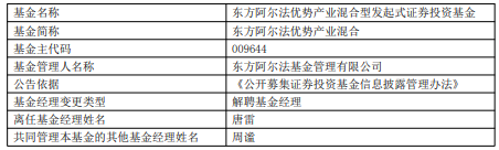 唐雷离任东方阿尔法优势产业混合