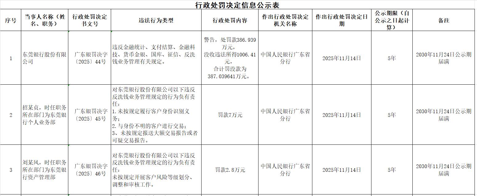 中国经济网北京11月26日讯 中国人民银行广东省分行网站近日发布中国人民银行广东省分行行政 处罚决定信息公示表(广东银罚决字〔2025〕44号-49号)。 广东银罚决字〔2025〕44号显示,东莞银行股份有限公司违反金融统计、支付结算、金融科技、货 币金银、国库、征信、反洗钱业务管理有关规定。中国人民银行广东省分行对其警告,处罚款386.939 万元,没收违法所得1006.41元,合计罚没款为387.039641万元。 广东银罚决字〔2025〕45号显示,招某贞(时任职务所在部门为东莞银行个人业务部)被罚款7万 元。 广东银罚决字〔2025〕48号显示,江某平(时任职务所在部门为东莞银行直销银行事业部)被罚款2.7 万元。 广东银罚决字〔2025〕49号显示,肖某明(时任职务所在部门为东莞银行合规部)被罚款1.2万元。 原文如下: | | | | | 行政处罚决定信息公示表 | | | | | | --- | --- | --- | --- | --- | --- | --- | --- | --- | | | 当事人名称(好 | 行政处罚决定 | | | 作出行政处罚决定 | 作出行政处罚决定日 | 公示期 ...