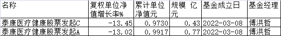 基金经理傅洪哲曾任中欧基金管理有限公司高级研究员。2019年7月加入泰康公募,后任泰康基金 股票研究员,2022年3月8日至今任基金经理。 | 名标 | | 复权单位净 累计单位 规模 亿 基金线理 | | | --- | --- | --- | --- | | | 值增长率% | 净值元 | 元 | | 泰康医疗健康股票发起C | -13.45 | 0. 9730 | 0.43 2022-03-08 博洪著 | | 泰康医疗健康股票发起A | -13.02 | 0. 9917 | 0.77 2022-03-08 博洪智 | | t | | | | (责任编辑:康博) 中国经济网北京1月13日讯 据同花顺数据显示,在刚过去的2025年,泰康医疗健康股票发起C、泰 康医疗健康股票发起A分别下跌13.45%和13.02%。 该基金2025年三季度前十大重仓股为晶泰控股、康龙化成、方舟健客、三生制药、昭衍新药、九安 医疗、奕瑞科技、羚锐制药、百普赛斯、毕得医药。 ...