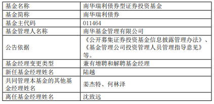 南华瑞利债券增聘陆越 沈致远离任