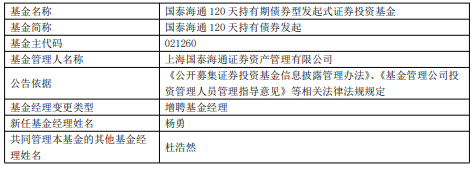 国泰海通120天持有债券发起增聘杨勇