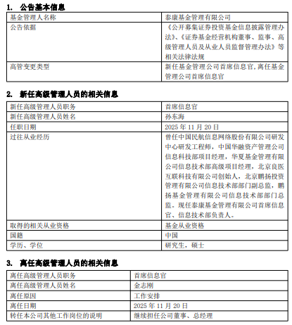 | 新任高级管理人员职务 | 首席信息官 | | --- | --- | | 新任高级管理人员姓名 | 孙东海 | | 任职日期 | 2025 年 11月 20日 | | 过往从业经历 | 曾任中国民航信息网络股份有限公司研发 | | | 中心研发工程师,中国华融资产管理公司 | | | 信息科技部项目经理,华夏基金管理有限 | | | 公司信息技术部高级项目经理,北京良医 | | | 互联科技有限公司创始人,北京鹏扬投资 | | | 管理有限公司信息技术部部门副总监,鹏 | | | 扬基金管理有限公司信息技术部部门总 | | | 监。现任泰康基金管理有限公司首席信息 | | | 官、信息技术部负责人。 | | 取得的相关从业资格 | 基金从业资格 | | 国籍 | 中国 | | 学历、学位 | 研究生,硕士 | | 离任高级管理人员职务 | 首席信息官 | | --- | --- | | 离任高级管理人员姓名 | 金志刚 | | 高任原因 | 工作安排 | | 离任日期 | 2025 年11月20日 | | 转任本公司其他工作岗位的说明 | 继续担任公司董事、总经理 | 中国经济网北京11月24日讯近日,泰 ...