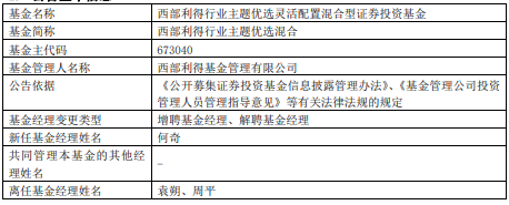 中国经济网北京11月24日讯近日,西部利得基金公告,西部利得行业主题优选混合增聘何奇,袁朔、周 平离任。 | 基金名称 | 西部利得行业主题优选灵活配置混合型证券投资基金 | | --- | --- | | 基金简称 | 西部利得行业主题优选混合 | | 基金主代码 | 673040 | | 基金管理人名称 | 西部利得基金管理有限公司 | | 公告依据 | 《公开募集证券投资基金信息披露管理办法》、《基金管理公司投资 管理人员管理指导意见》等有关法律法规的规定 | | 基金经理变更类型 | 增聘基金经理、解聘基金经理 | | 新任基金经理姓名 | 何奇 | | 共同管理本基金的其他经 | | | 理姓名 | | | 离任基金经理姓名 | 袁朔、周平 | 西部利得行业主题优选混合A/C成立于2016年3月11日和2016年5月25日,截至2025年11月21日,其今年 来收益率为2.38%、2.30%,成立来收益率为86.96%、83.11%,累计净值为1.8299元、1.7064元。 何奇2012年7月至2014年5月任长江证券股份有限公司研究部分析师、高级分析师,2014年5月至2020年5 月任光大保德 ...