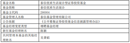 中国经济网北京11月24日讯 今日,泰信基金公告,泰信优质生活混合增聘陈颖。 | 基金名称 | 泰信优质生活混合型证券投资基金 | | --- | --- | | 基金简称 | 泰信优质生活混合 | | 基金主代码 | 290004 | | 基金管理人名称 | 泰信基金管理有限公司 | | 公告依据 | 《公开募集证券投资基金信息披露管理办法》 | | 基金经理变更类型 | 增聘基金经理 | | 新任基金经理姓名 | 陈颖 | | 共同管理本基金的其他经 | 吴秉韬 | | 理姓名 | | (责任编辑:康博) 泰信优质生活混合成立于2006年12月15日,截至2025年11月21日,其今年来收益率为4.26%,成立 来收益率为44.90%,累计净值为1.7137元。 陈颖曾任职于北京德丰华投资公司研究员、光大证券资产管理有限公司研究员、敦和资产管理有限 公司基金经理兼高级分析师、申港证券投资经理。2021年12月加入泰信基金管理有限公司拟任基金经 理,2022年1月起任基金经理。 ...