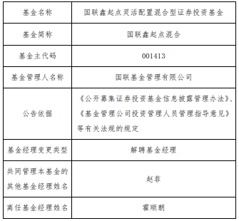 | 基金名称 | 国联鑫起点灵活配置混合型证券投资基金 | | --- | --- | | 基金简称 | 国联鑫起点混合 | | 基金主代码 | 001413 | | 基金管理人名称 | 国联基金管理有限公司 | | 公告依据 | 《公开募集证券投资基金信息披露管理办法》、 《基金管理公司投资管理人员管理指导意见》 | | | 等有关法规的规定 | | 基金经理变更类型 | 解聘基金经理 | | 共同管理本基金的 其他基金经理姓名 | 赵菲 | | 离任基金经理姓名 | 霍顺朝 | (责任编辑:康博) 赵菲2008年8月至2011年5月曾任国泰君安证券股份有限公司证券及衍生品投资总部投资经理;2011 年5月至2012年11月曾任嘉实基金管理有限公司结构产品投资部专户投资经理。2012年11月加入国联基 金管理有限公司,现任多策略投资部基金经理。 国联鑫起点混合A/C成立于2015年6月12日,截至2025年11月21日,其今年来收益率为17.78%、 17.47%,成立来收益率为22.56%、14.56%,累计净值为1.2204元、1.1427元。 中国经济网北京11月24日讯 近日,国联基金公告,霍顺朝离 ...