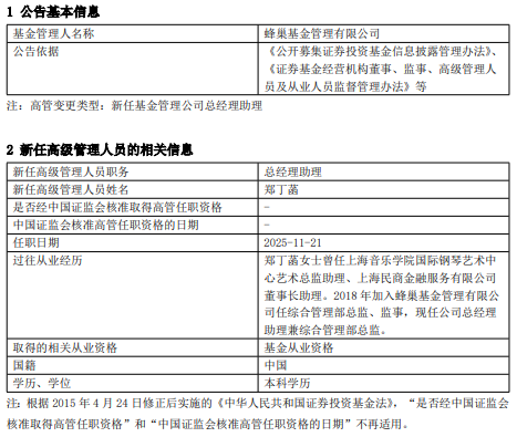 郑丁菡曾任上海音乐学院国际钢琴艺术中心艺术总监助理、上海民商金融服务有限公司董事长助 理。2018年加入蜂巢基金管理有限公司任综合管理部总监、监事,现任公司总经理助理兼综合管理部总 监。 | 新任高级管理人员职务 | 总经理助理 | | --- | --- | | 新任高级管理人员姓名 | 郑丁茜 | | 是否经中国证监会核准取得高管任职资格 | | | 中国证监会核准高管任职资格的日期 | | | 任职日期 | 2025-11-21 | | 过往从业经历 | 郑丁菡女士曾任上海音乐学院国际钢琴艺术中 | | | 心艺术总监助理、上海民商金融服务有限公司 | | | 董事长助理。2018年加入蜂巢基金管理有限公 | | | 司任综合管理部总监、监事,现任公司总经理 | | | 助理兼综合管理部总监。 | | 取得的相关从业资格 | 基金从业资格 | | 国籍 | 中国 | | 学历、学位 | 本科学历 | 中国经济网北京11月24日讯 近日,蜂巢基金公告,任命郑丁菡为总经理助理。 | 基金管理人名称 | 蜂巢基金管理有限公司 | | --- | --- | | 公告依据 | 《公开募集证券投资基金信息披露管理 ...