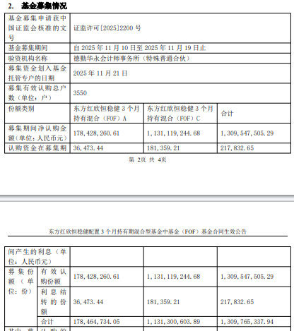 募集期间净认购金额1,309,547,505.29元,认购资金在募集期间产生的利息217,832.65元,募集份额 合计1,309,765,337.94份。 基金经理陈文扬曾任上海国利货币经纪有限公司利率衍生产品部经纪人,宁波银行股份有限公司金 融市场部交易员,南京银行股份有限公司金融市场部高级投资经理,上海东方证券资产管理有限公司固 定收益研究员、投资主办人。2020年6月至今任基金经理。 | 基金募集申请获中 | | | | | --- | --- | --- | --- | | 国证监会核准的文 | 证监许可[2025]2200 号 | | | | ਵੇ | | | | | 基金享集期间 | 自2025年11月10日至2025年11月19日止 | | | | 验资机构名称 | 德勤华永会计师事务所(特殊普通合伙) | | | | 募集资金划入基金 | 2025年11月21日 | | | | 托管专户的日期 | | | | | 募集有效认购总户 | 3550 | | | | 数(单位:户) | | | | | 份额类别 | 东方红胶恒稳健3个月 | 东方红胶恒稳健3个月 | 合计 | | | 持有混合(F ...