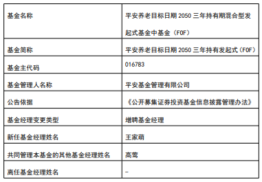 平安养老目标日期2050三年持有发起式(FOF)成立于2024年03月07日,截至2026年01月08日,其今 年来收益率为2.13%,成立来收益率为22.57%,累计净值为1.2257元。 | 基金名称 | 平安养老目标日期 2050 三年持有期混合型发 | | --- | --- | | | 起式基金中基金(FOF) | | 基金简称 | 平安养老目标日期2050 三年持有发起式(FOF) | | 基金主代码 | 016783 | | 基金管理人名称 | 平安基金管理有限公司 | | 公告依据 | 《公开募集证券投资基金信息披露管理办法》 | | 基金经理变更类型 | 增聘基金经理 | | 新任基金经理姓名 | 王家萌 | | 共同管理本基金的其他基金经理姓名 | 高萝 | | 高任基金经理姓名 | | (责任编辑:康博) 中国经济网北京1月13日讯 今日,平安基金公告,平安养老目标日期2050三年持有发起式(FOF) 增聘王家萌。 王家萌曾先后担任中国银行上海市分行金融培训生、国投安信期货有限公司量化研究员、平安道远 投资管理(上海)有限公司交易员、浙江慧度资产管理有限公司量化研究员。2020年6月加入 ...