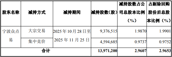 2025年10月28日至2025年11月25日,宁波众点易减持股数为13,971,200股,减持股数占公司总股本 比例2.9607%,占剔除回购股份后总股本比例2.9653%。 | | | | | 减持股数占公 | 占剔除回购 | | --- | --- | --- | --- | --- | --- | | 股东名称 | 減持方式 | 减持期间 | | 减持股数(股)司总股本比例 股份后总股 | | | | | | | (%) | 本比例(%) | | 宁波众点 易 | 大宗交易 | 2025年10月28日至 | 9,376,515 | 1.9870 | 1.9901 | | | 集中竞价 | 2025 年 11月 25 日 | 4,594,685 | 0.9737 | 0.9752 | | | 合计 | | 13,971,200 | 2.9607 | 2.9653 | 中国经济网北京11月26日讯 易点天下(301171.SZ)昨日晚间发布关于披露简式权益变动报告书的提 示性公告。公司控股股东、实际控制人邹小武之一致行动人宁波众点易企业管理合伙企业(有限合伙) (曾用名"宁波众点股权投资合伙企业(有限合伙 ...