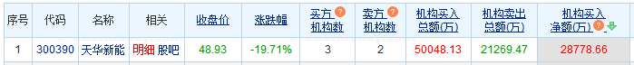 | 序号 | 代码 | 名称 | 相关 | 收盘价 | 张浩唱 | 买方 3 卖方 0 | | 机构买入 | 加物园品 | 机构买入 | | --- | --- | --- | --- | --- | --- | --- | --- | --- | --- | --- | | | | | | | | 机构数 | 机构数 | 農额(万) | 鳥额(万) | 泽额(万) 3 � | | | 300390 天华新能 明细 股吧 | | | 48.93 | -19.71% | ์ | | 50048.13 | 21269.47 | 28778.66 | | 买入金额最大的前5名 | | | | | | | | | --- | --- | --- | --- | --- | --- | --- | --- | | 序号 | 交易营业部名称 | | | 买入金额(万) | 占总成交比例 | 卖出金额(万) | 占总成交比例 | | 1 | 深般通专用 | | 789次 44.49% 2 | 37653.92 | 7.04% | 27372.85 | 5.12% | | 2 | 机构专用 | | 1629次 40.95% ...