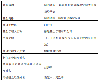 雷冠中与黄浩荣离任融通通跃一年定开债券发起