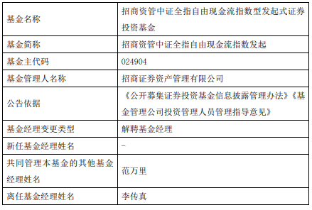 中国经济网北京11月21日讯 昨日,招商证券资产管理有限公司公告,李传真离任招商资管中证全 指自由现金流指数发起、招商资管核心优势混合。 李传真现任招商资管基金经理,曾任招商资管高端制造行业研究员,负责中游制造行业的研究,历 任安信证券资产管理部权益研究员,投资经理助理。2023年6月12日起任招商资管基金经理。 | 基金名称 | 招商资管核心优势混合型证券投资基金 | | --- | --- | | 基金简称 | 招商资管核心优势混合 | | 基金主代码 | 880006 | | 基金管理人名称 | 招商证券资产管理有限公司 | | 公告依据 | 《公开募集证券投资基金信息披露管理办法》《基 | | | 金管理公司投资管理人员管理指导意见》 | | 基金经理变更类型 | 兼有增聘和解聘基金经理 | | 新任基金经理姓名 | 蔡霖 | | 共同管理本基金的其他基金 | | | 经理姓名 | | | 离任基金经理姓名 | 李传真 | (责任编辑:康博) 招商资管中证全指自由现金流指数发起A/C成立于2025年9月12日,截至2025年11月20日,成立来 收益率为7.43%、7.40%。 招商资管核心优势混合A ...
