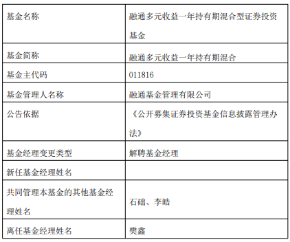 中国经济网北京11月21日讯 今日,融通基金公告,樊鑫离任融通多元收益一年持有期混合。 樊鑫2018年7月加入融通基金管理有限公司,担任固定收益部研究员,2023年3月6日起任基金经 理。 (责任编辑:康博) 融通多元收益一年持有期混合成立于2021年8月3日,截至2025年11月20日,其今年来收益率 为-0.11%,成立来收益率为-1.06%,累计净值为0.9894元。 | 基金名称 | 融通多元收益一年持有期混合型证券投资 | | --- | --- | | | 事令 | | 基金简称 | 融通多元收益一年持有期混合 | | 基金主代码 | 011816 | | 基金管理人名称 | 融通基金管理有限公司 | | 公告依据 | 《公开募集证券投资基金信息披露管理办 法》 | | 基金经理变更类型 | 解聘基金经理 | | 新任基金经理姓名 | | | 共同管理本基金的其他基金经 | 石础、李皓 | | 理姓名 | | | 离任基金经理姓名 | 樊善 | ...
