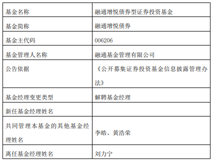 | 基金名称 | 融通增悦债券型证券投资基金 | | --- | --- | | 基金简称 | 融通增悦债券 | | 基金主代码 | 006206 | | 基金管理人名称 | 融通基金管理有限公司 | | 公告依据 | 《公开募集证券投资基金信息披露管理办 | | | 法》 | | 基金经理变更类型 | 解聘基金经理 | | 新任基金经理姓名 | | | 共同管理本基金的其他基金经 | 李皓、黄浩荣 | | 理姓名 | | | 离任基金经理姓名 | 刘力宁 | (责任编辑:康博) 刘力宁2016年7月至2020年7月在中国进出口银行资金营运部工作,2020年8月至2023年3月在渤海银 行股份有限公司担任债券交易专员,2023年4月加入融通基金管理有限公司。 融通增悦债券成立于2018年9月14日,截至2025年11月20日,其今年来收益率为-0.30%,成立来收 益率为26.94%,累计净值为1.2484元。 中国经济网北京11月21日讯 今日,融通基金公告,刘力宁离任融通增悦债券。 ...