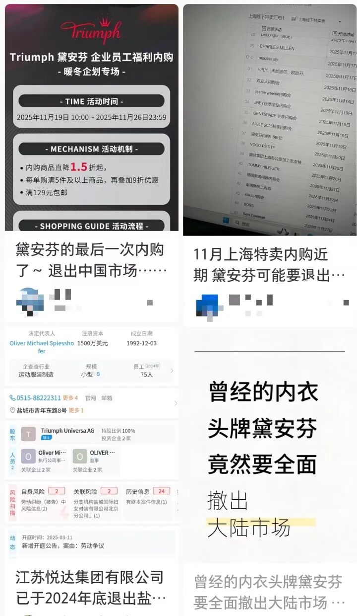 "第一件钢圈内衣就是黛安芬的,没想到要撤柜了。""高中时妈妈买的第一件品牌内衣,印象很深刻, 怎么就要撤出了?" | 12 | 劳动纠纷(被告)中 风险信息(2) | 分支机构盐城国际妇 有终本案件信息(1) 女时装有限公司北京 | 上一篇 | | --- | --- | --- | --- | | | | 分公司 ... (1) | | | 动 高 | 开庭时间:2025-03-11 新增开庭公告,案由:劳动争议 6-11 \ | | | 将"钢圈内衣"引入中国 作为全球知名的内衣品牌,黛安芬的历史可追溯至1886年,由Gottfried Spieshofer和Michael Braun在德 国巴登符腾堡州成立,最初名为"Spieshofer&Braun"紧身内衣工厂。其总部位于瑞士苏黎世,是全球最 大的内衣制造商之一,年销售额达16亿美元,年产内衣超2亿套,产品覆盖欧洲、亚洲、美洲等多个市 场。 黛安芬与中国市场的渊源最早始于1979年,当时品牌开始在中国开展来料加工业务,是较早进入中国供 应链的国际内衣品牌。1992年起,黛安芬先后在盐城、海南成立生产公司,逐步搭建本土化生产体系。 2001年至2002 ...