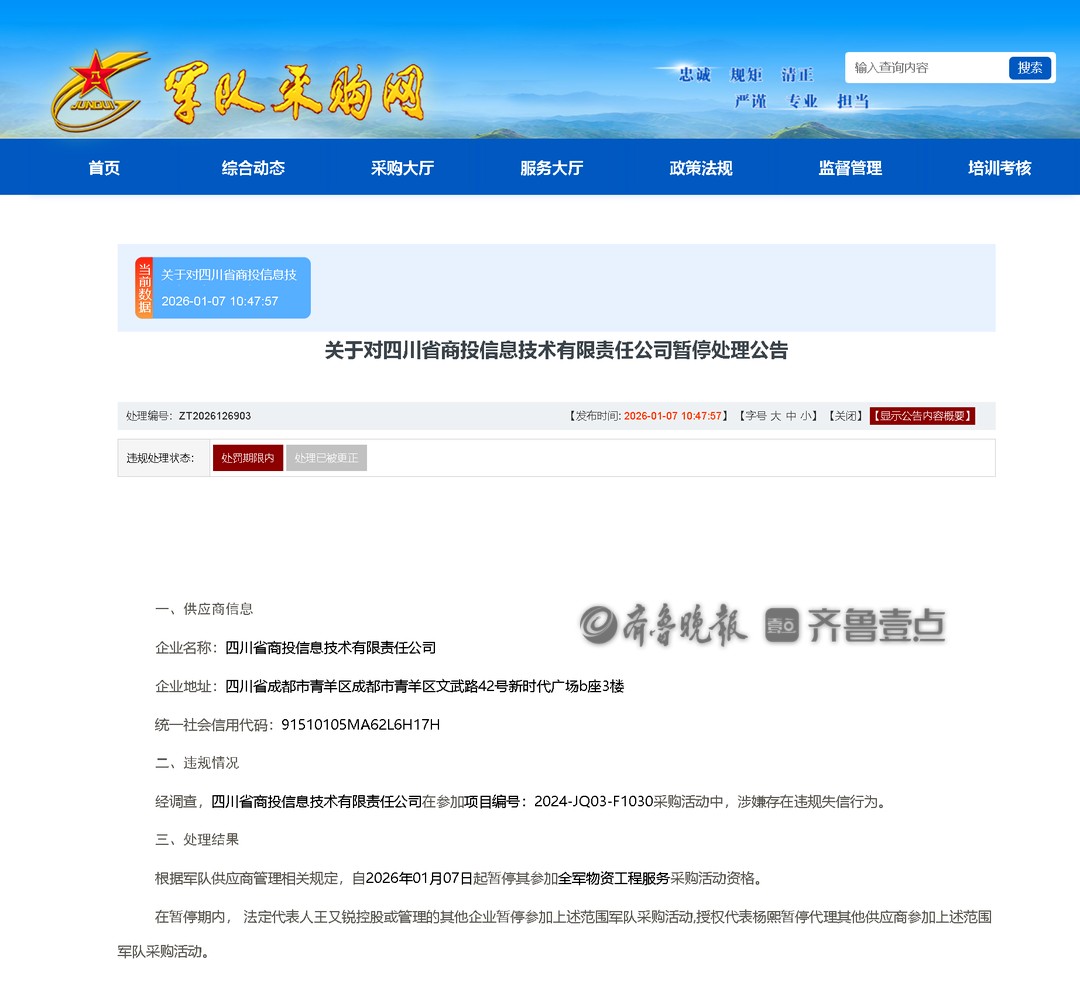 近日,军队采购网发布关于对四川省商投信息技术有限责任公司暂停处理公告。 经调查,四川省商投信息技术有限责任公司在参加项目编号:2024-JQ03-F1030采购活动中,涉嫌存在违规失信行为。 根据军队供应商管理相关规定,自2026年01月07日起暂停其参加全军物资工程服务采购活动资格。 在暂停期内,法定代表人王又锐控股或管理的其他企业暂停参加上述范围军队采购活动,授权代表杨熙暂停代理其他供应商参加上述范围军队采购活动。 | | | | | 忠诚 规矩 清正 专业 严谨 | 输入查询内容 担当 | 搜索 | | --- | --- | --- | --- | --- | --- | --- | | 首页 | 综合动态 | 采购大厅 | 服务大厅 | 政策法规 | 监督管理 | 培训考核 | | ਜੋਂ | 关于对四川省商投信息技 2026-01-07 10:47:57 | | | | | | | 处理编号:ZT2026126903 | | | 【发布时间: 2026-01-07 10:47:57】【字号 大 中 小】【关闭】【显示公告内容概要】 | | --- | --- | --- | --- | | 违规处 ...
