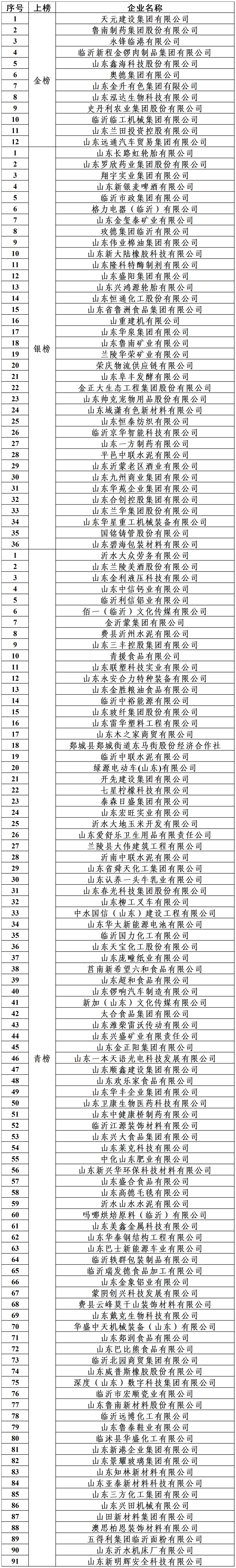 临沂民营经济“凤凰榜”发布与市场主体概况 - 临沂市召开民营经济大会并发布“凤凰榜”共有139家企业上榜 其中“凤凰金榜”12家 “凤凰银榜”36家 “凤凰青榜”91家 [1] - 临沂市民营经济发达 市场主体总量突破156万户 位居山东省第2位 位列中国民营经济百强城市活力榜第25位 [1] - 上榜企业及全市百万市场主体被视为推动临沂高质量发展的核心力量 体现了临商群体的奋斗精神 [1] “凤凰榜”上榜企业名单(按榜单层级) - 凤凰金榜企业共12家 包括天元建设集团 鲁南制药 永锋临港 临沂新程金锣 山东鑫海科技 奥德集团 山东金升有色 山东泓达生物 史丹利农业集团 临沂临工机械 山东兰田投资控股 山东远通汽车贸易 [2] - 凤凰银榜企业共36家 包括山东长路虹轮胎 山东罗欣药业 翔宇实业集团 山东新银麦啤酒 临沂市政集团 格力电器(临沂)等 [2][3] - 凤凰青榜企业共91家 包括沂水大众劳务 山东兰陵美酒 金沂蒙集团 费县沂州水泥 绿源电动车(山东) 山东认养一头牛乳业 山东庞幢纸业等 [3][4][5][6] 上榜企业所涉主要行业分布 - **建筑业与工程机械**:天元建设集团 临沂市政集团 山重建机 山东华星重工 开先建设集团 山东顺鑫建设集团 山东柳工叉车等 [2][3][4][5] - **医药与生物科技**:鲁南制药集团 翔宇实业集团 山东罗欣药业 山东一方制药 山东卫康生物医药 山东中健康桥制药 山东戴克生物科技等 [2][3][5][6] - **食品与农产品加工**:临沂新程金锣肉制品 史丹利农业集团 山东省鲁洲食品集团 山东阜丰发酵 青援食品 莒南新希望六和食品 山东欢乐家食品 五得利集团临沂面粉等 [2][3][4][5] - **化工与材料**:奥德集团 山东泓达生物科技 山东恒通化工 金正大生态工程 山东玻纤集团 山东宏旺实业 山东天宝化工 山东三方化工集团等 [2][3][4][6] - **汽车与装备制造**:山东远通汽车贸易 山东锣响汽车制造 山东潍柴雷沃传动 山东巴士新能源车业 山东威普斯橡胶等 [2][3][5][6] - **矿业与金属冶炼**:永锋临港 山东鑫海科技 山东金升有色 山东金玺泰矿业 山东鲁南矿业 兰陵华荣矿业 山东域潇有色新材料等 [2][3] - **商贸物流**:山东兰田投资控股 荣庆物流供应链 山东九州商业集团 山东兰华集团 临沂北园商贸集团等 [2][3][6] - **其他制造业**:格力电器(临沂) 玫德集团临沂有限公司 山东碧海包装材料 绿源电动车(山东) 山东景耀玻璃集团等 [2][3][4][6]