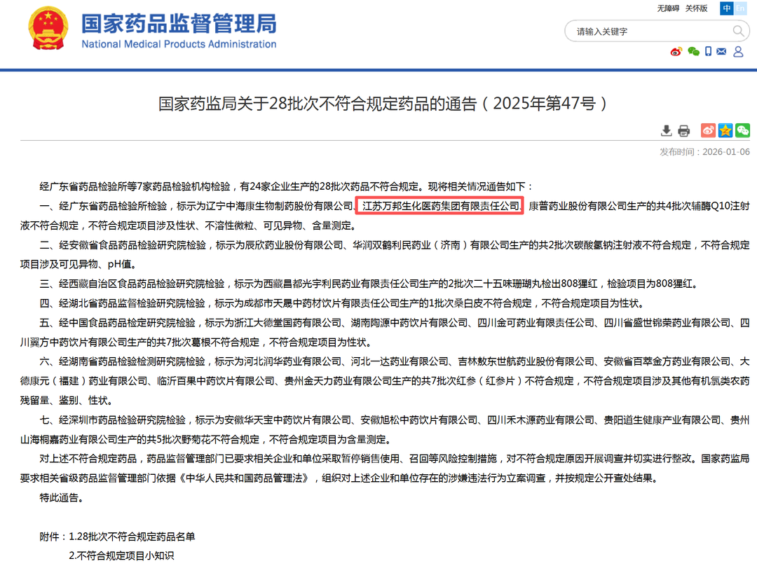 齐鲁晚报·齐鲁壹点 记者 张洁清 1月6日,国家药监局发布2025年第47号通告,经广东省药品检验所检验,标示为江苏万邦生化医药集团有限责任公司生产的辅酶Q10注射液不符合规定。 根据公告显示,不符合规定项目涉及性状、不溶性微粒、可见异物、含量测定。对上述不符合规定药品,药品监督管理部门已责令企业对涉事药品采取暂 停销售使用、召回等风险控制措施,深入调查不符合规定原因并完成整改。省级药监部门将依据《中华人民共和国药品管理法》对企业涉嫌违法行为立案 调查,查处结果将按规定公开。 天眼查显示,江苏万邦生化医药集团有限责任公司是上海复星医药(600196)产业发展有限公司全资子公司,后者则是上海复星医药(集团)股份有限公 司(复星医药 600196.SH)全资子公司。上海复星医药(集团)股份有限公司成立于1994年,是一家创新驱动的全球化医药健康产业集团,直接运营的业 务包括制药、医疗器械与医学诊断、医疗健康服务,并通过联营公司国药控股覆盖到医药商业领域。 根据官网显示,2024年,江苏万邦生化医药集团有限责任公司更名为复星万邦(江苏)医药集团有限公司,是一家集研发创新、生产制造与市场推广于一 体的集团化企业。公司 ...
