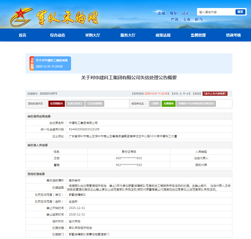 因围标串标,中建科工集团上榜军队采购失信名单