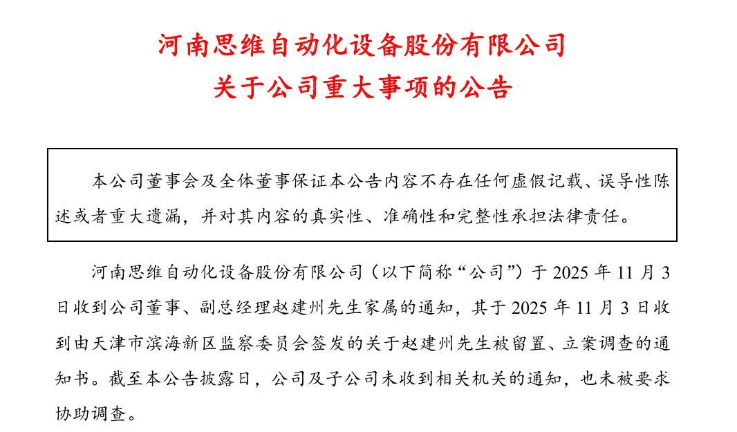 【深圳商报讯】(首席记者 谢惠茜)11月3日晚间,思维列控发布《关于公司重大事项的公告》,公告 中披露"收到公司董事、副总经理赵建州家属通知,其于2025年11月3日收到由天津市滨海新区监察委员 会签发的关于赵建州先生被留置、立案调查的通知书。" 思维列控称,截至目前,公司及子公司未收到相关机关的通知,也未被要求协助调查。公司拥有完善的 组织架构和规范的治理体系,公司其他董事、监事和高级管理人员均正常履职,生产经营秩序正常。同 时表示,"公司尚未知悉上述事项的进展及结论。公司将持续关注后续进展,对相关工作进行妥善安 排,并按照有关法律、法规的规定和要求,及时履行信息披露义务。" 公开资料显示,赵建州曾任郑州铁路局电务检测所调研员,河南蓝信科技股份有限公司董事长、总经 理。2019年10月,赵建州补选为思维列控非独立董事,随后出任副总经理。 值得一提的是,在思维列控发布此公告之前,公司股价已连续两天大跌。11月4日,思维列控继续下 跌。截至收盘,该股下跌2%。自10月31日至今,思维列控股价已跌超20%。 ...