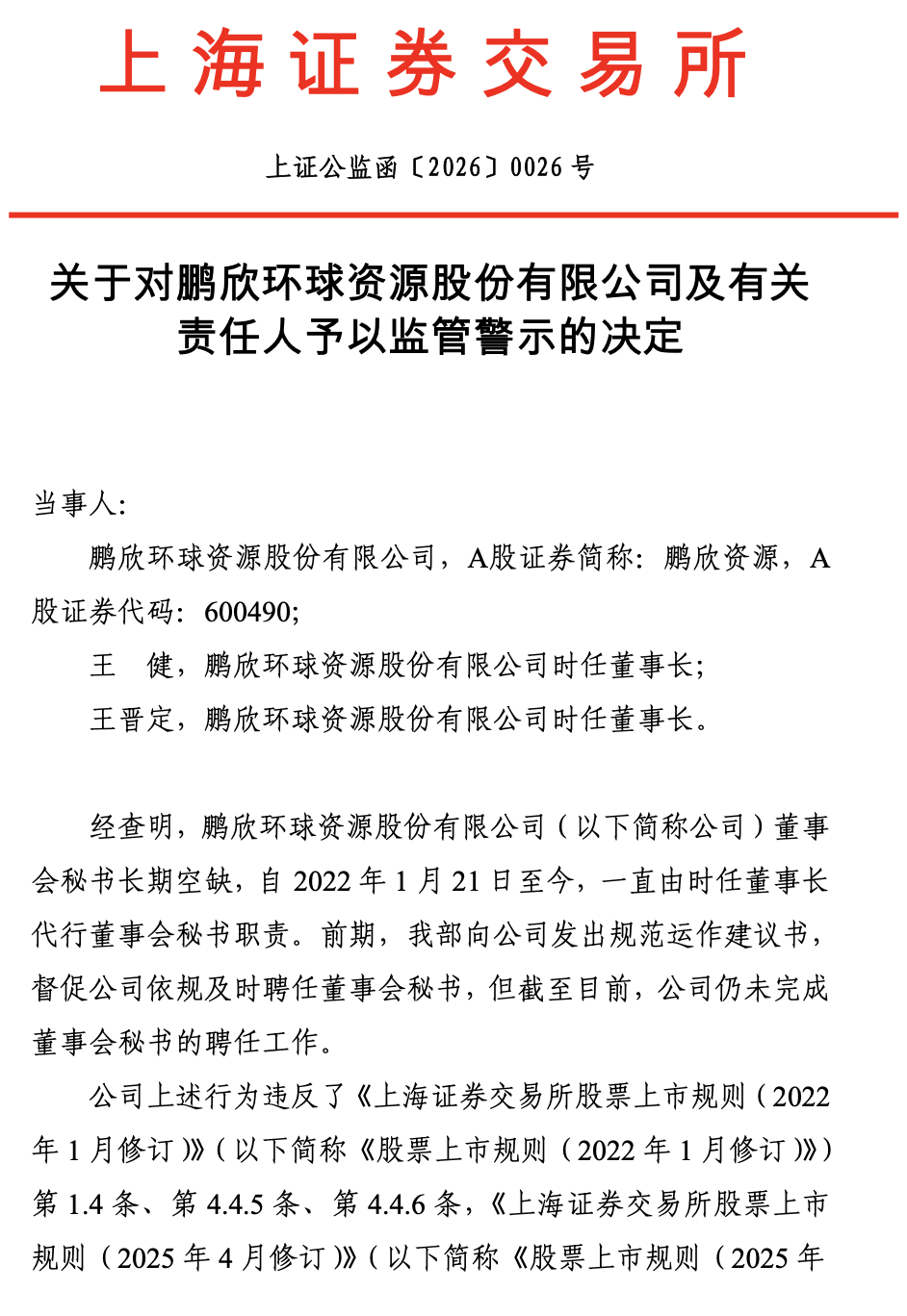 董秘职位空悬4年!鹏欣资源及两时任董事长被警示