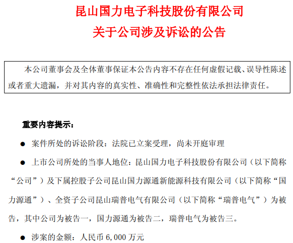 11月3日,国力电子(688103)发布公告,公司于 2025年10月31日收到了天津市第三中级人民法院发来 的《民事起诉状》等相关材料。厦门宏发电力电器有限公司就专利权纠纷向公司及子公司提起诉讼。 公司及控股子公司国力源通、全资子公司瑞普电气为被告,其中公司为被告一,国力源通为被告二,瑞 普电气为被告三。涉案的金额6000万元,截至公告日,该案件尚未开庭审理。 厦门宏发声称公司的直流接触器产品侵犯了其4项专利。请求判令公司及附属公司侵犯其4项专利,并赔 偿经济损失及为制止侵权行为而支出的合理费用合计6000万元。此外,厦门宏发请求判令公司及子公司 立即停止侵犯原告涉案专利的行为,并销毁相关产品库存及相关模具。 公司表示,公司对厦门宏发的4项涉案专利做了较为充分的研究分析,认为有较强的证据可以证明这4项 专利应属无效,且公司产品也并不侵犯该4项专利。厦门宏发基于该4项专利向公司及下属子公司国力源 通、瑞普电气合计索赔6000万元,缺乏事实和法律上的依据。公司于2025年11月3日向国家知识产权局 提起针对涉案专利的无效宣告请求程序。 "下一步,公司将对是否构成专利侵权提出合理抗辩。由于本案尚未开庭,本次涉及的 ...